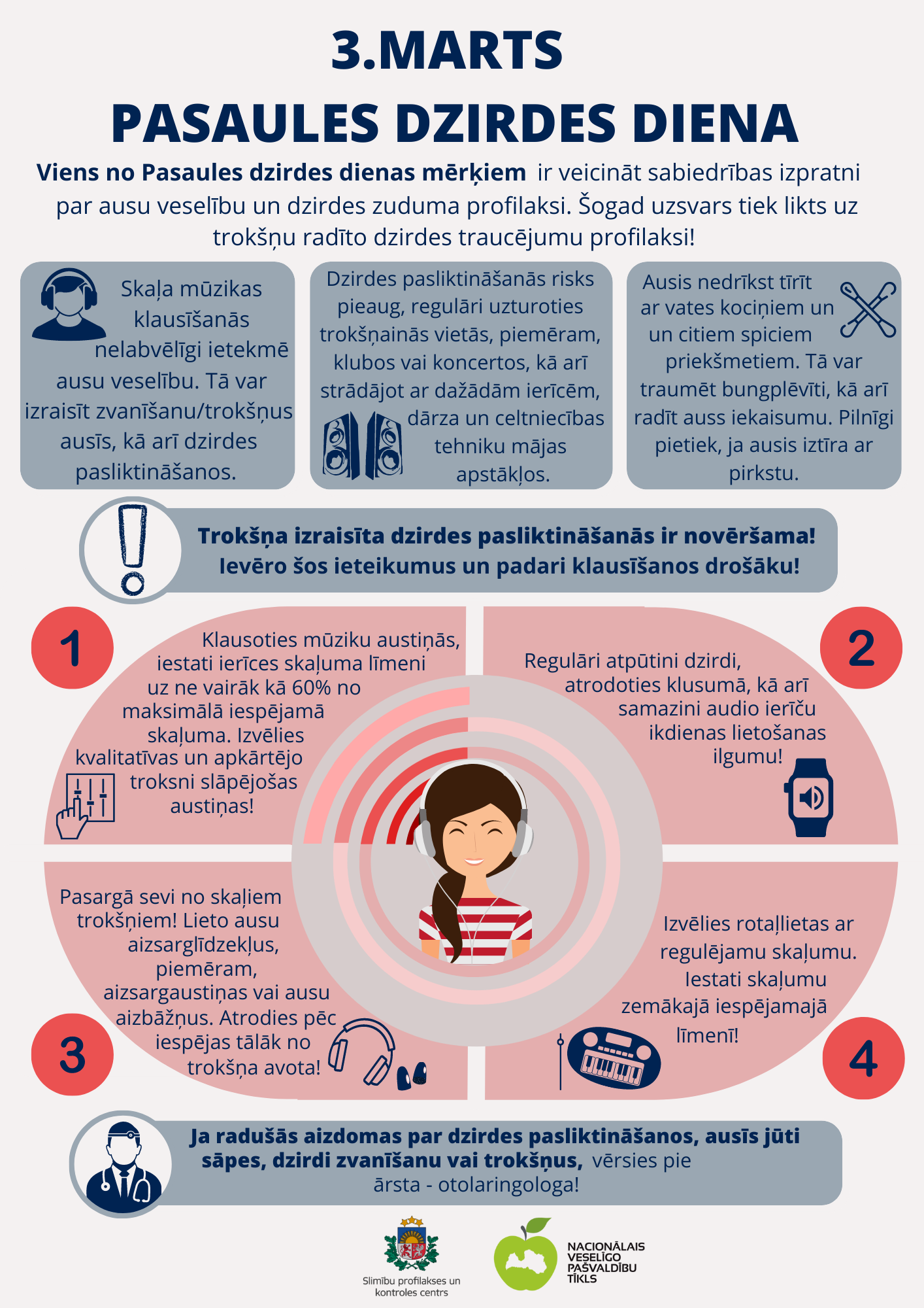 Uzmanība tiek pievērsta drošas klausīšanās nozīmei un labas dzirdes saglabāšanai!