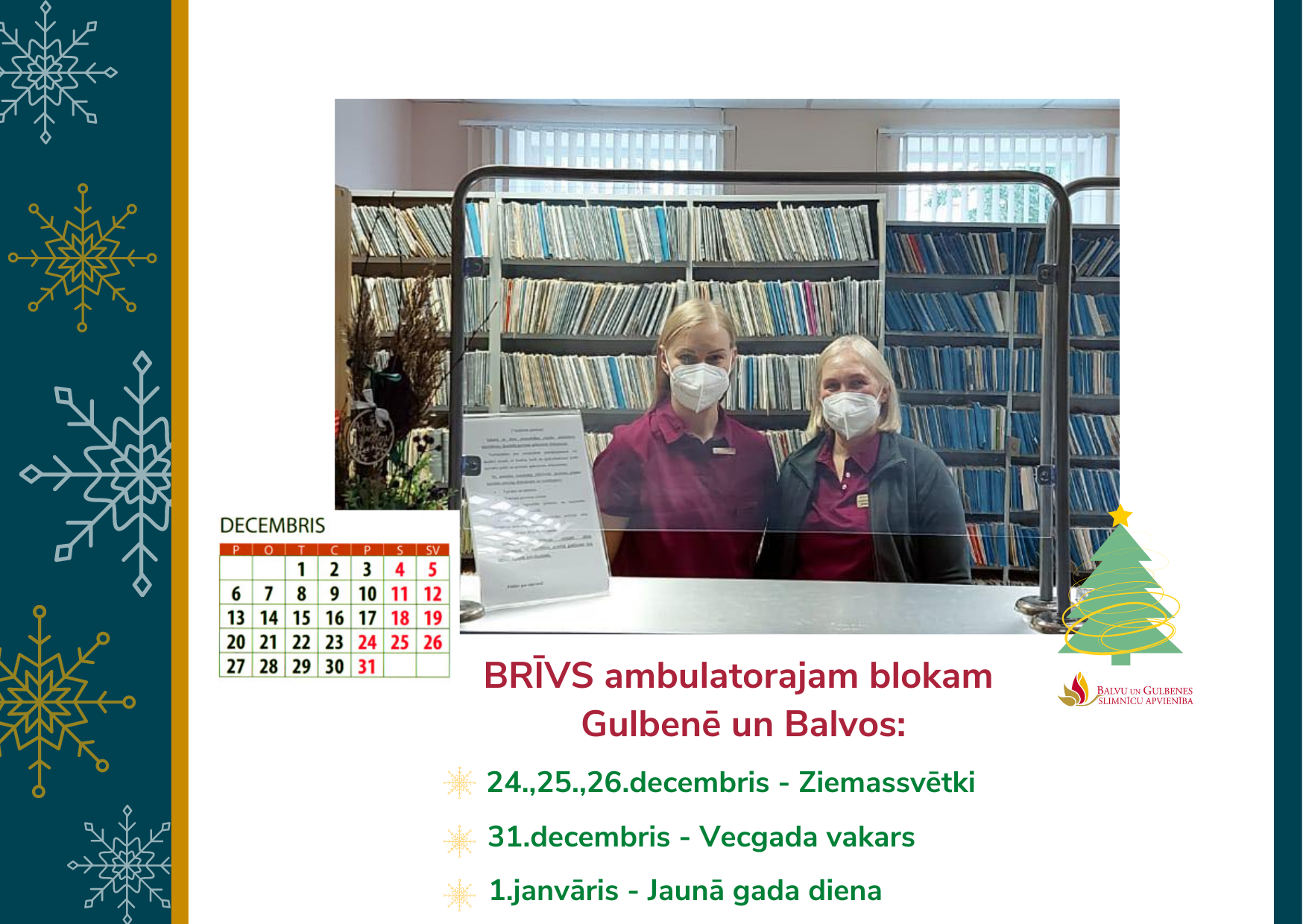 SIA “Balvu un Gulbenes slimnīcu apvienība” informē, ka Ziemassvētkos, no 24. līdz 26. decembrim, un Vecgada vakarā, 31. decembrī un 1. janvārī, Balvu slimnīcas uzņemšanas nodaļa un Steidzamās medicīniskās palīdzības punkts strādās ierastajā režīmā,