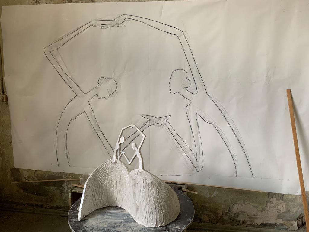 Darbiņi pie vides objekta “Dejošie eņģeļi” notiek mākslinieces Elizabetes Melbārzdes mākslas telpā. Mālā tiek veidotas sejas un rokas, kas ir ilgs un lēns process, slīpējot sejas izteiksmes. Kā saka māksliniece: “Neskatoties uz stilizāciju un vienkāršoto formu, cenšos tās izveidot skaistas un laimīgas.”